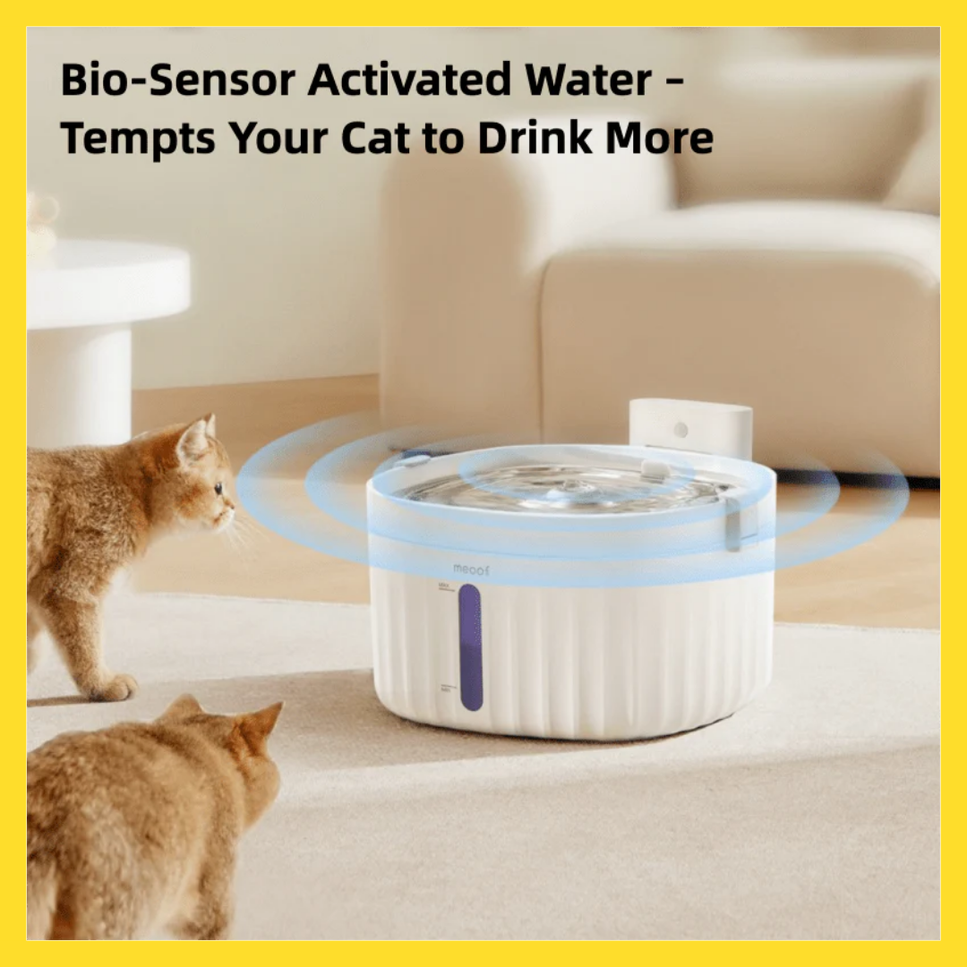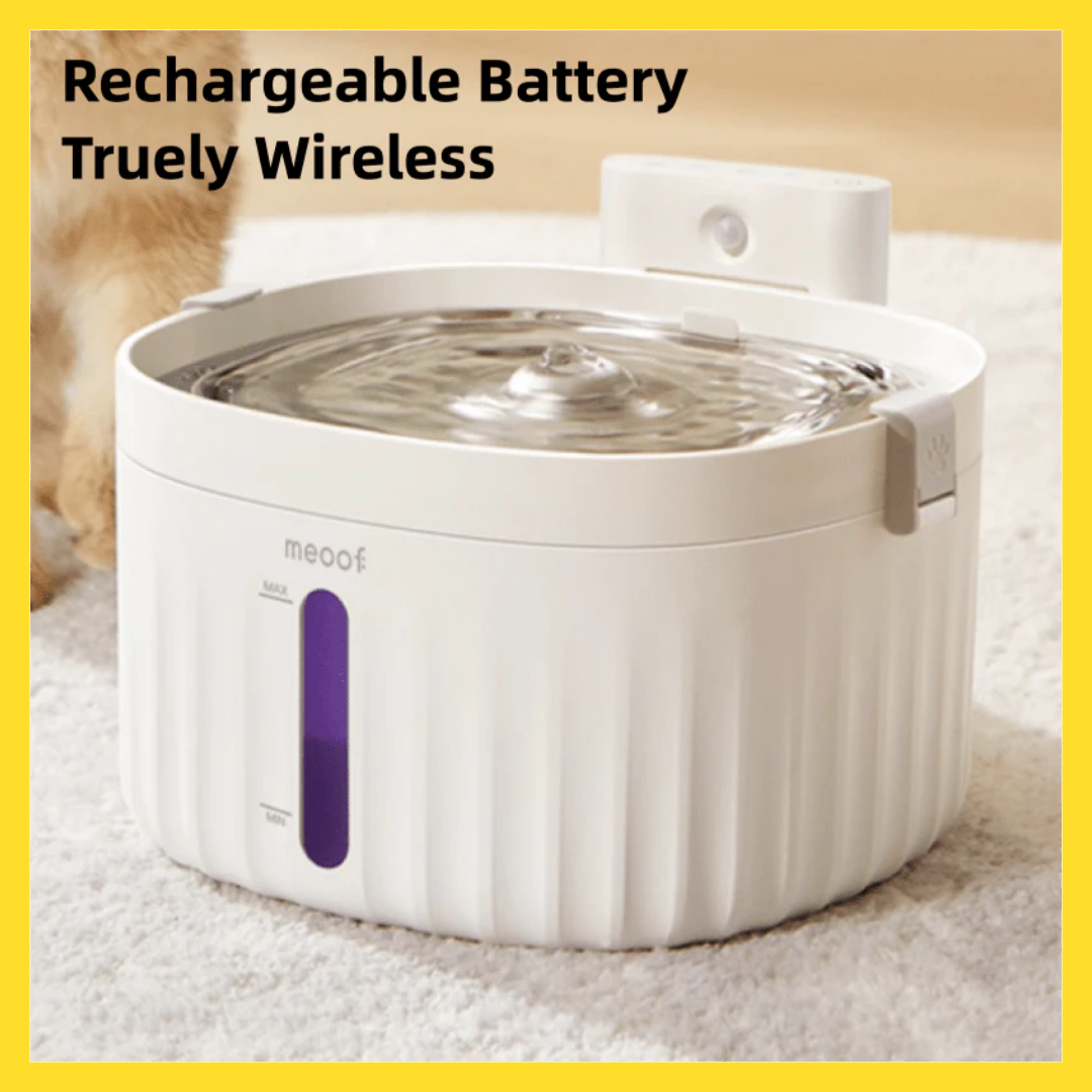 Say hello to the MEOOF Automatic Wireless Water fountain! It detects your pet from up to 2 meters away and automatically dispenses water. No more messy wires – our patented pump is wire-free and super quiet, running at less than 30dB. The triple-filter system keeps water fresh and tasty, while the sponge protects the pump. With a 2L capacity, it’s perfect for cats and small dogs, and lasts up to a week. Plus, the transparent window and LED indicator make monitoring easy. BPA-free and built to last!